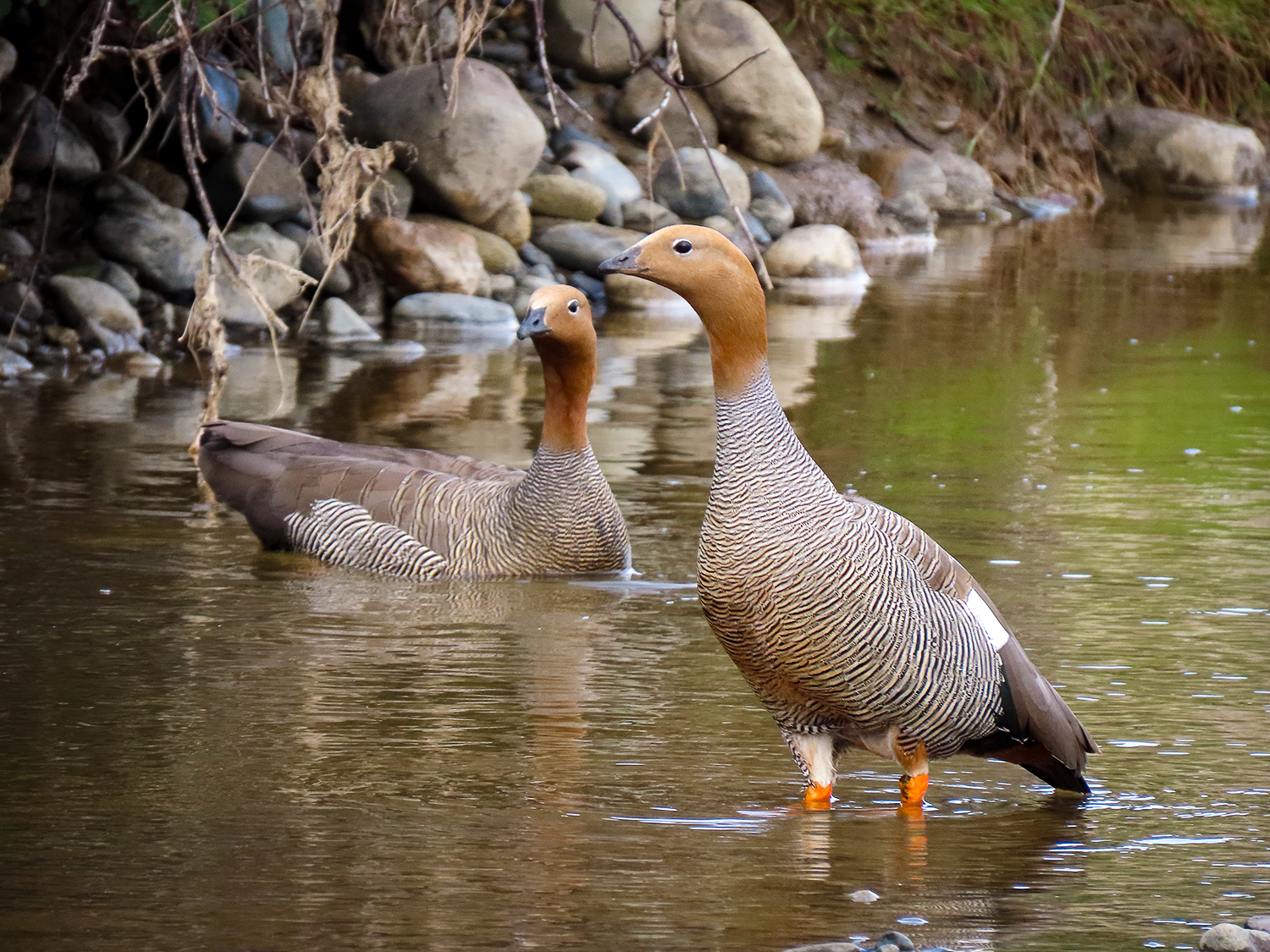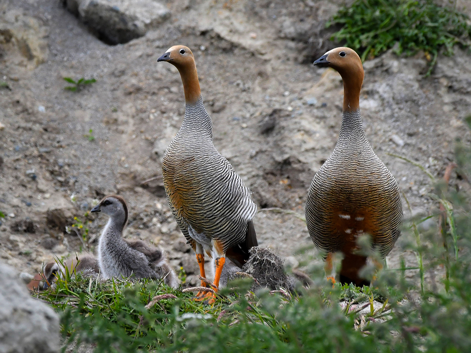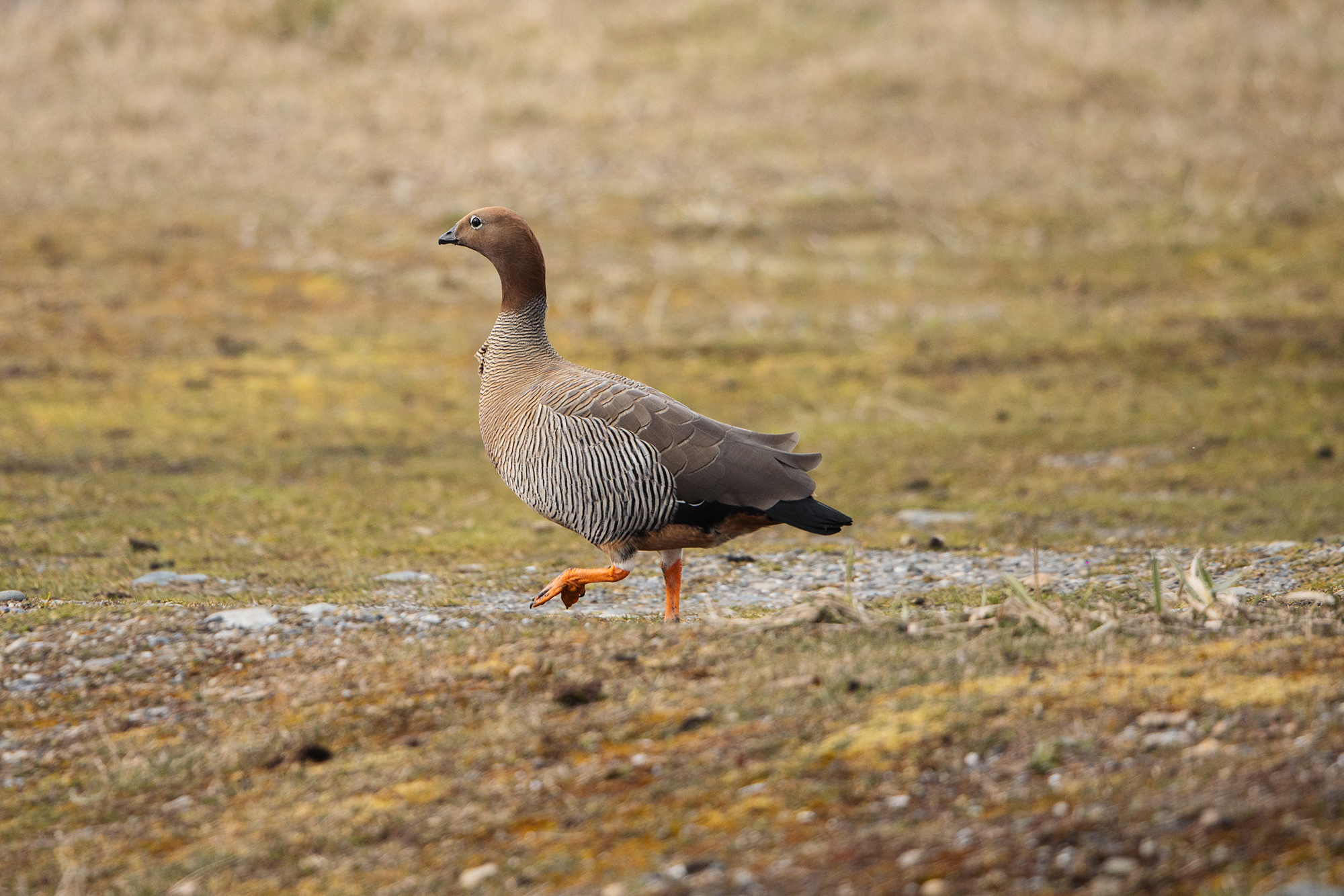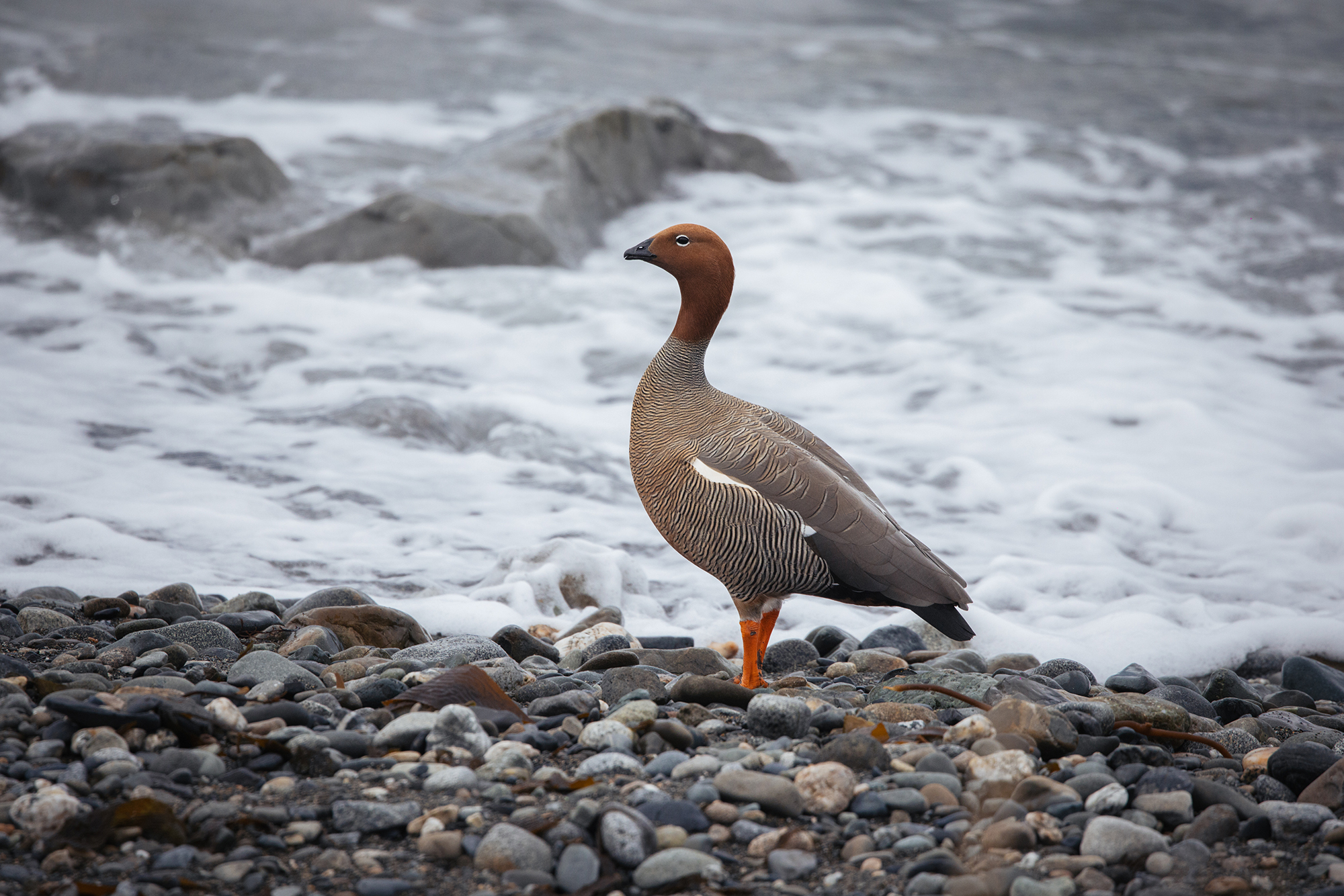 The Ruddy-headed Goose (Chloephaga rubidiceps) is the rarest, smallest, and most threatened of the four Chloephaga species found in Patagonia in Chile and Argentina. Males and females are similar in appearance, measuring approximately 50 centimeters in length. The head and upper half of the neck are cinnamon-colored, which gives the species its name. The lower half of the neck, mantle, breast, and flanks show white to cinnamon tones with fine black transverse barring. The legs are orange, and there is a white ring around the eye.