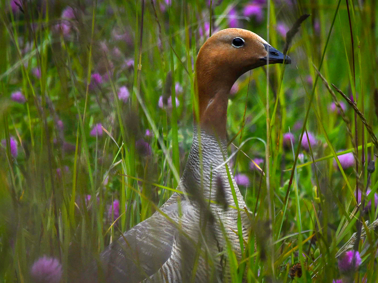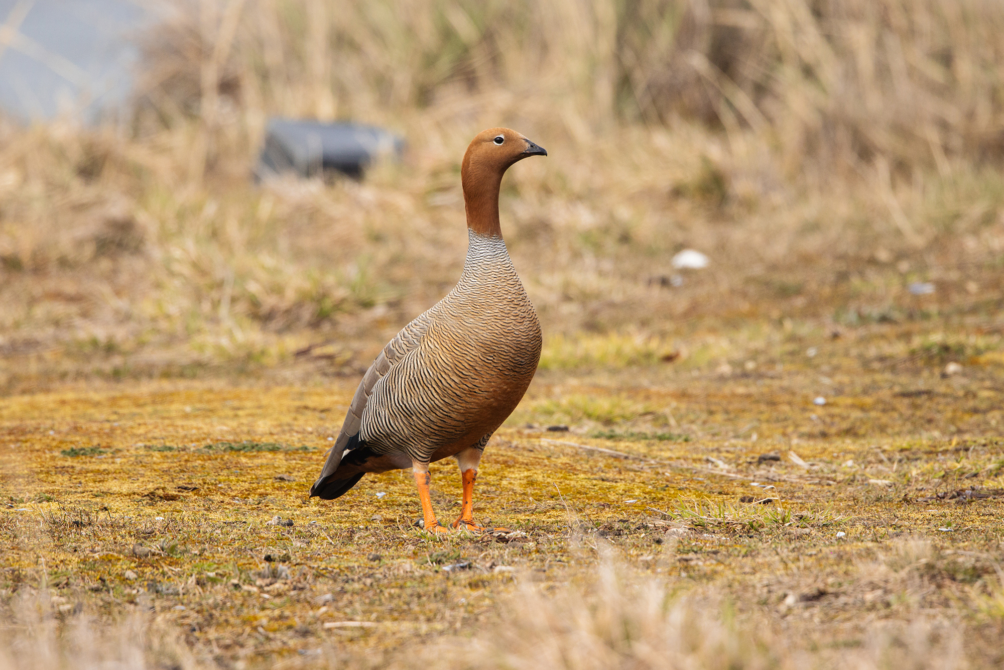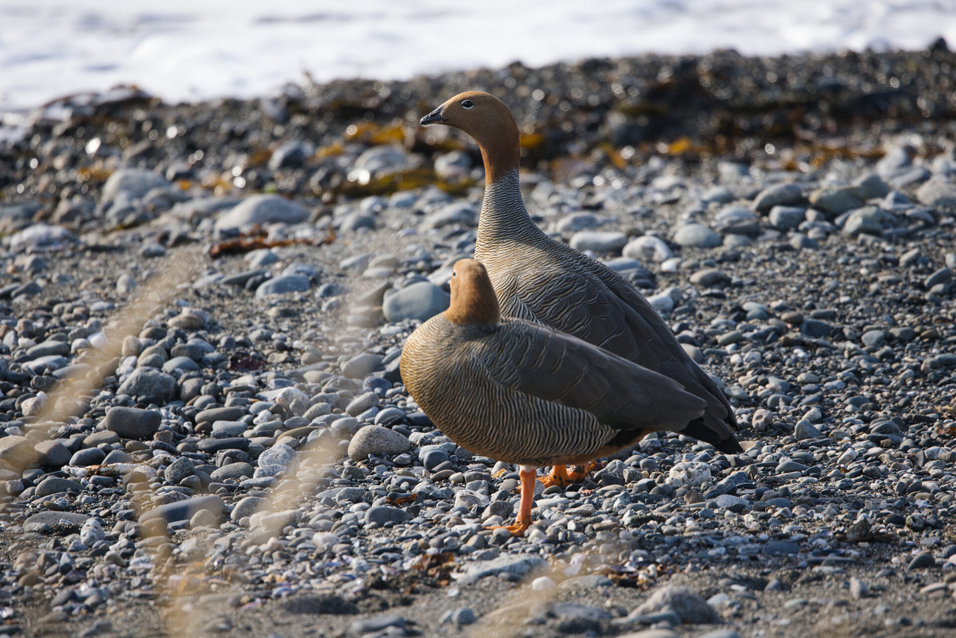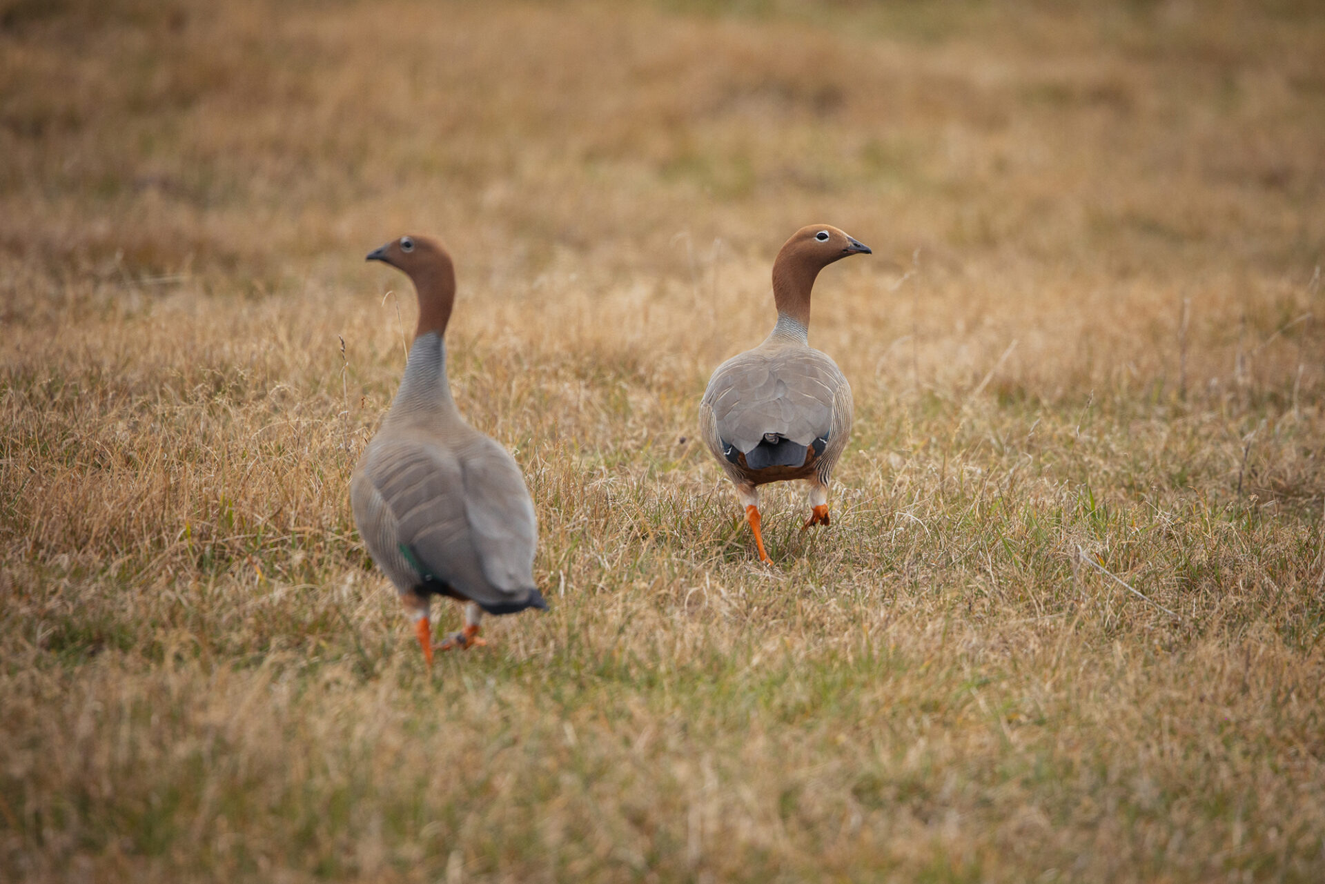 The Ruddy-headed Goose (Chloephaga rubidiceps) is the rarest, smallest, and most threatened of the four Chloephaga species found in Patagonia in Chile and Argentina. Males and females are similar in appearance, measuring approximately 50 centimeters in length. The head and upper half of the neck are cinnamon-colored, which gives the species its name. The lower half of the neck, mantle, breast, and flanks show white to cinnamon tones with fine black transverse barring. The legs are orange, and there is a white ring around the eye.